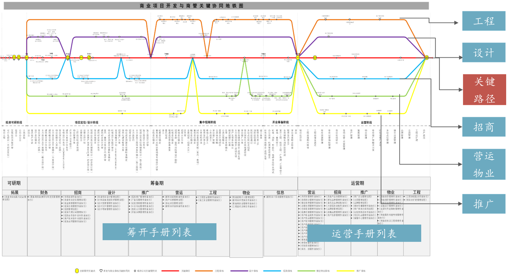 该协同总图围绕商业项目开发关键路径,上下分布工程、设计、招商、营运、物业、推广等各专业,涵盖商业项目开发所有关键管控节点,实现从项目拿地到开业运营的全价值链管理。如下图所示。