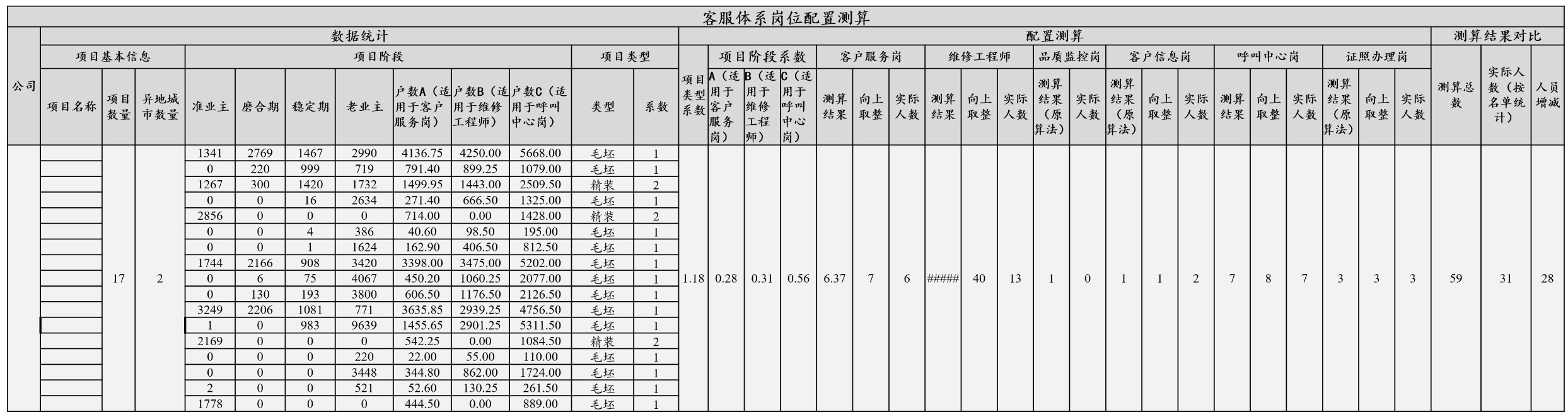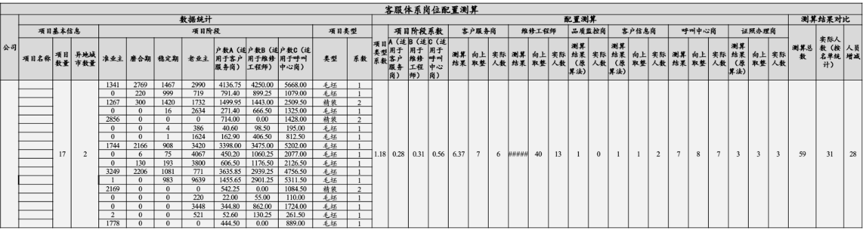 vv以配置标准为例,可以通过精细化测算(考虑各项目阶段户数、项目类型)、精准化分析(区分岗位、物业地产编制)、精益化对标(标杆企业“岗位配置”、“人均效能”双指标对比),建立项目客服人员滚动配置模型。如某标杆企业实践案例: