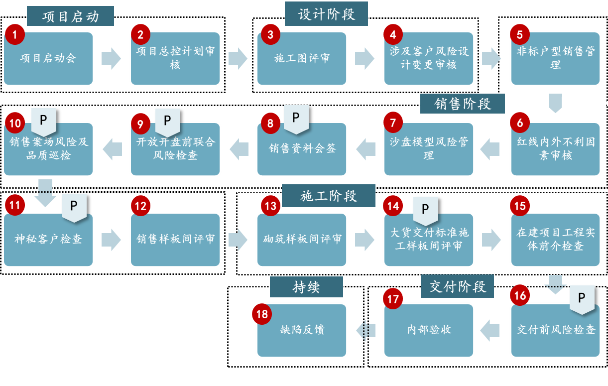 同时,为解决企业当前发展阶段的关键客服业务流程痛点,应深入探究痛点产生原因,有针对性地进行流程优化改造。以风险控制为例,可参考风险控制18步法,要求客服从项目启动即作为监督者的角色介入项目,并固化过程中每个步骤的工作标准及工作要求,逐渐实现客服由后端向前端的转变。