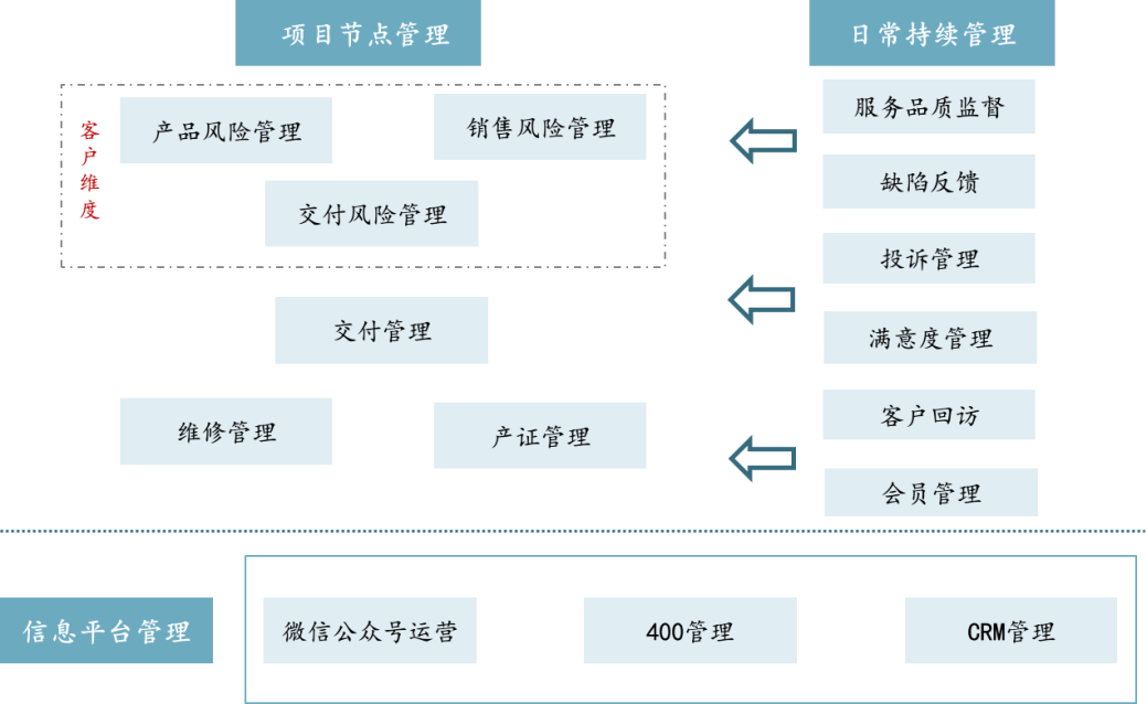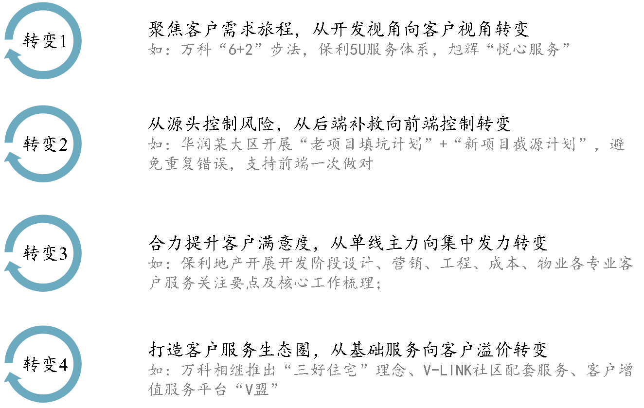 就传统地产开发思维而言,客服通常在开发价值链的后端、临近交付前才逐步介入项目工作,此时项目的主体建设包括园林景观近乎完成,事实上客户满意度分项指标已不可逆转,此时的客户管理形同虚设。企业在搭建客户关系管理体系过程中,一个常见短板是看重内部专业管理能力的优化,而缺乏以客户的真正需求为目标导向的体系优化。同时与开发链条割裂,局限于后端的“救火队员”角色也是客户关系能力提升的另一难题。