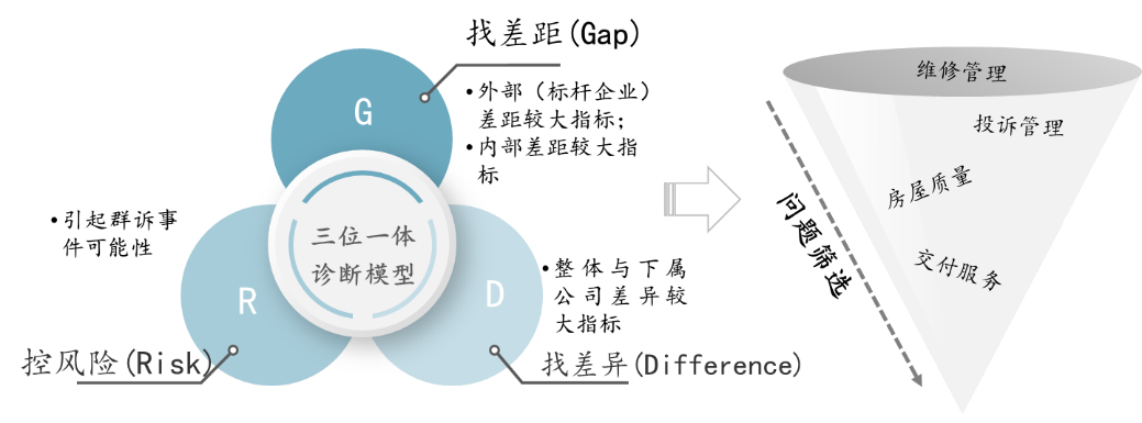 例如,H房企区域公司将客户满意度提升作为未来一定时间内的重点工作之一,在满意度调研结果的基础上,通过四位一体+重大风险控制模型,精准把握客户满意度提升突破口,最终明晰6个重点方向,即房屋质量、签约后服务、交付服务、维修管理、投诉管理和园区规划及配套。在此基础上,根据数据分析与经验总结不难判断,交付不满意表现在房屋质量、公区配套、销售承诺等方面而并非交付服务本身,因此交付管理暂不作为提升重点。