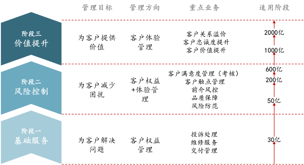 从标杆实践总结来看,以企业的发展规模与客户关系管理体系管理成熟度为基准,可将客户关系管理分为基础服务、风险控制、价值提升三个渐进阶段,不同阶段的管理目标与关键业务侧重不同。