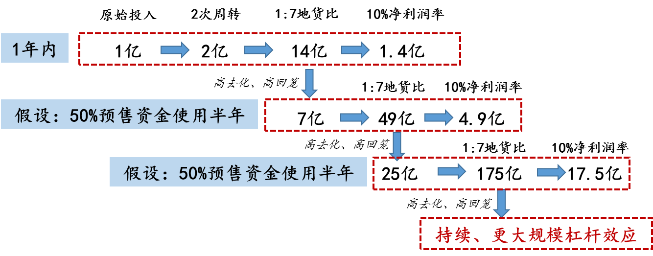 地产作为资金密集型行业,其规模及利润与现金流密切相关,项目自身现金流贡献可以为企业提供规模杠杆实现利润倍增。假设项目地货比为1:7,项目净利润率为10%,一年可实现2次周转:则原始投入1亿,当年可实现总货值14亿,净利润1.4亿;项目预售资金的50%再投入到新项目,循环两年,可实现175亿的规模和17.5亿的利润。