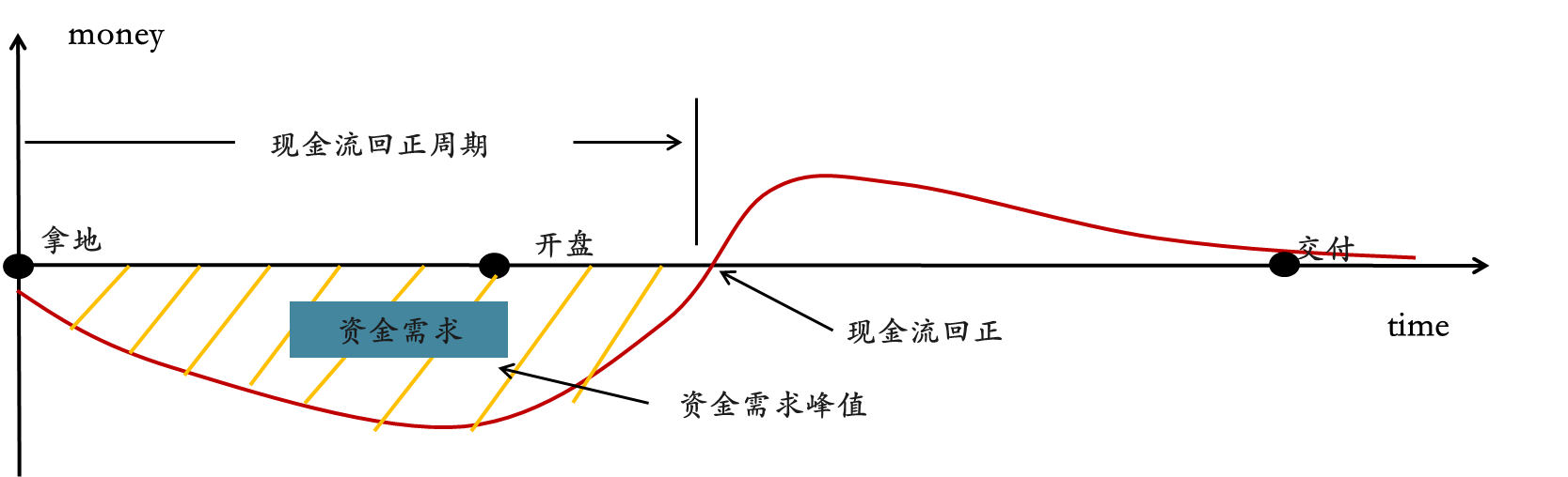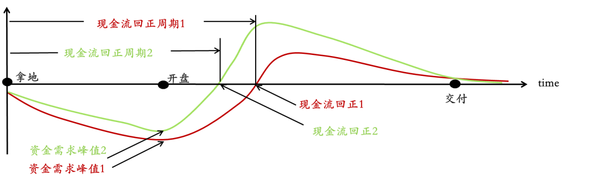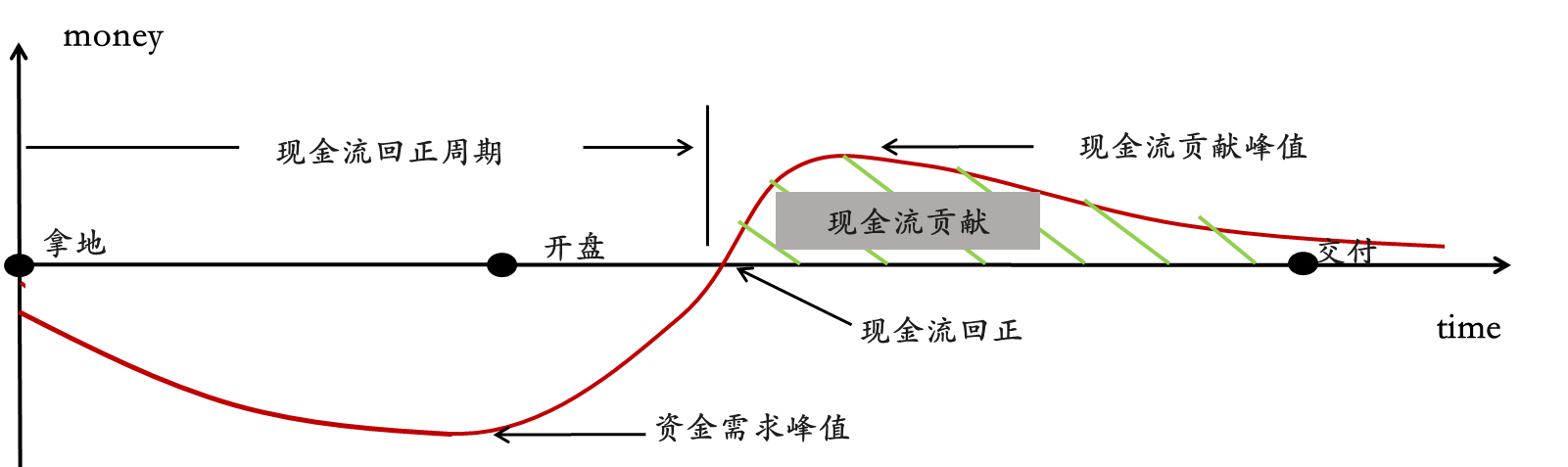 地价越高,资金峰值越高,需要的回款越多,现金流回正越慢;因此地货比越高,现金流回正越慢。