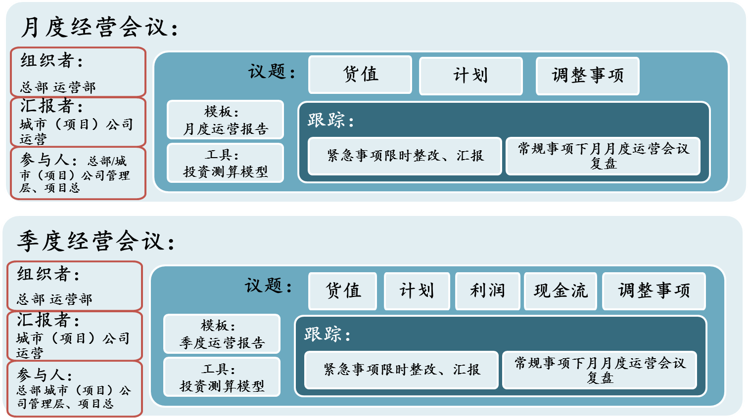 针对不同经营定位的项目,需要差异化的运营标准,包括计划标准、去化标准、回款标准等,如碧桂园的“456”、万科的“5986”。同时,项目运行过程中,需要对现金流进行动态的监控,对计划的改变、销售的改变带来的现金流的变化进行跟踪和分析。具体可以通过经营会议、经营月报来实现现金流的监控。
