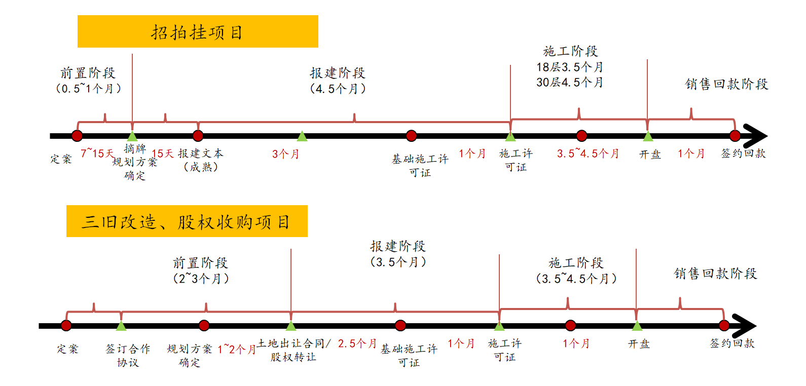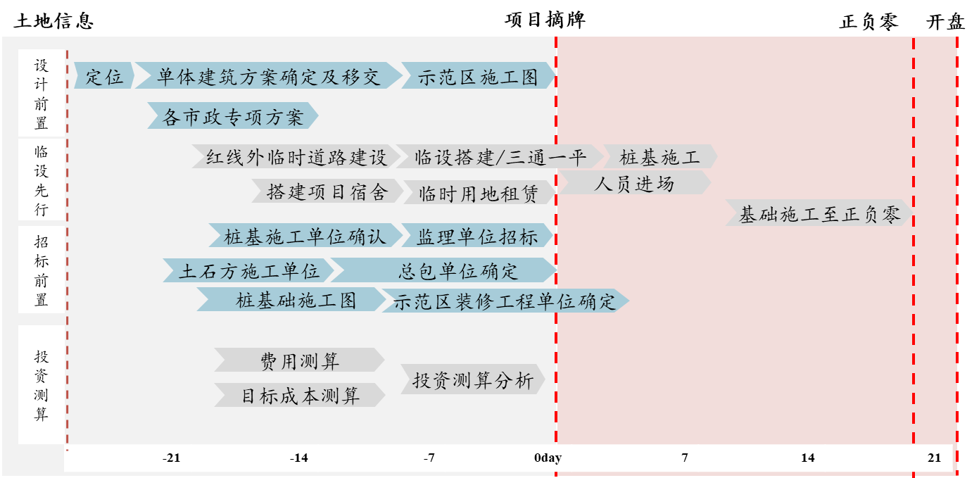 早起跑常见做法:拿地前完成定位、概念,可以缩短拿地后设计周期30天;土方提前施工,走前期工程报建;总包提前进场,总包入围单位的考察以及发标准备工作前置到施工图出图前,在完成招标图后进行总包发标工作,合同计价方式采用综合单价;展示区设计单独立项,在概念设计方案完成后(展示区选址及定位确定)独立开展,可加速展示区开放周期1个月;展示区开放至少在开盘前1个月,有效保证蓄客期,可加速项目去化速度。