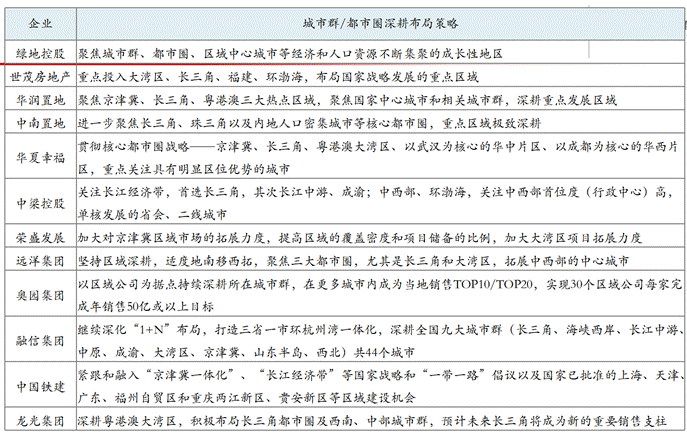 城市群和都市圈已成为国民经济发展的动力引擎,国家在战略层面全力推动城市群和都市圈城市协同发展,在强大的人口红利、资源吸附能力以及产业基础之上,众多标杆房企都将国家战略重点发展区域及城市群纳入投资布局战略版图。(如表1)
