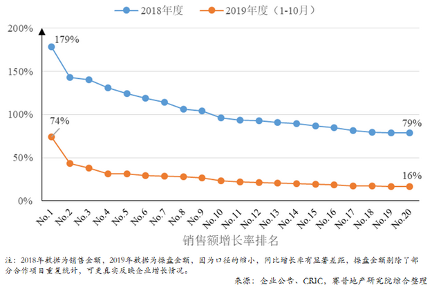 2019年以来房企销售额增长率TOP20企业仍然以中小规模企业为主导,一方面在于基数小增长率高,另一方面也反映出部分中小企业仍然具备高增长的潜力和连续性。这些潜力特征也有一些共性。