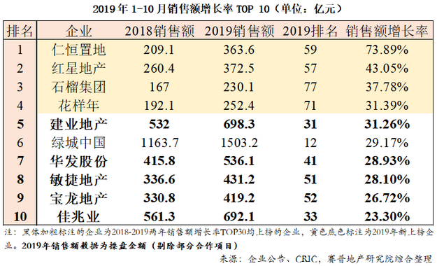 2019年1-10月的销售额增长率TOP10企业名单中,“熟面孔”占到半数,建业、华发、敏捷、宝龙和佳兆业也曾出现在2018年高增长率榜单,它们现在的规模都在500亿上下。如表1。