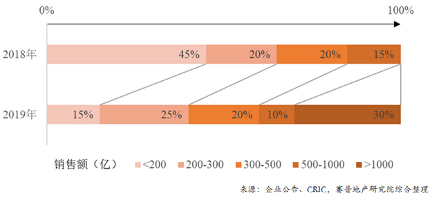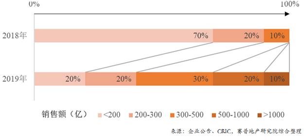 可见,基数小在增速上有先天优势,但也看得到,各梯队都有高增速房企,关键比拼能力,但规模200亿以下的高增速企业在减少,小企业进一步丧失高增长机会。