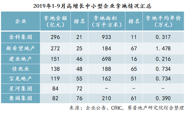 表4 2019年1-9月高增长中小型企业拿地情况汇总