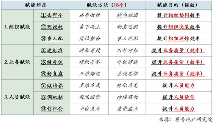 以“赋能罗盘”中的组织赋能为例,提升组织协同效率的赋能方法即扁平敏捷、横向拉通,成为房企区域合并、人员精简背后的驱动因素与企业实现能效升级的重要一环。