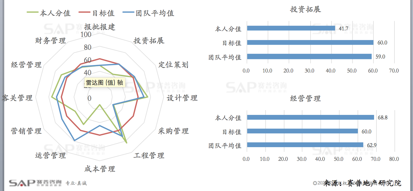 在专业能力测试方面,赛普根据多年来的地产行业咨询服务积累,研发出专业能力KPC测试题库,题库覆盖房地产全价值链各专业知识和能力内容,贴近房地产业务,题型多样,涵盖单选、多选、判断和情景案例等题型。专业测评结果数据可与行业标杆值、均值、目标值以及团队均值进行对比,辅助明晰差距与提升方向,赛普可协助提供相应改进建议。