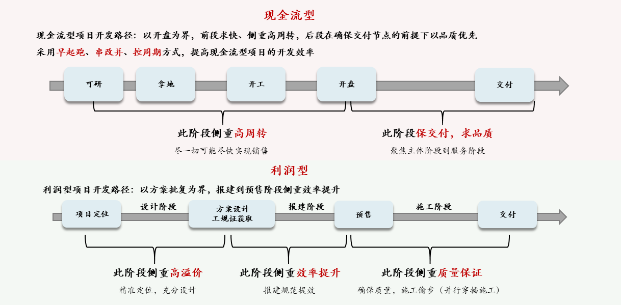 不是所有企业都能做到“456”的开发模式,房企不能盲目求快,要依据战略导向的不同采取差异化的经营策略。现金流型企业更关注效率,在可研到开盘阶段注重高周转,尽一切可能尽快实现销售,在开盘到交付阶段保交付进度,注重品质实现;利润型房企对品质的关注高于效率,在可研到方案阶段进行精准定位、充分设计,注重高溢价,在方案到预售阶段注重效率提升,报建规范有效,在预售到交付阶段,注重品质保证。