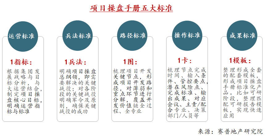 对于操盘手册的设计,赛普总结了五大标准,即:运营标准(指标)、兵法标准(纲领)、路径标准(路径图)、操作标准(场景卡)和成果标准(表单模板)。如图1。