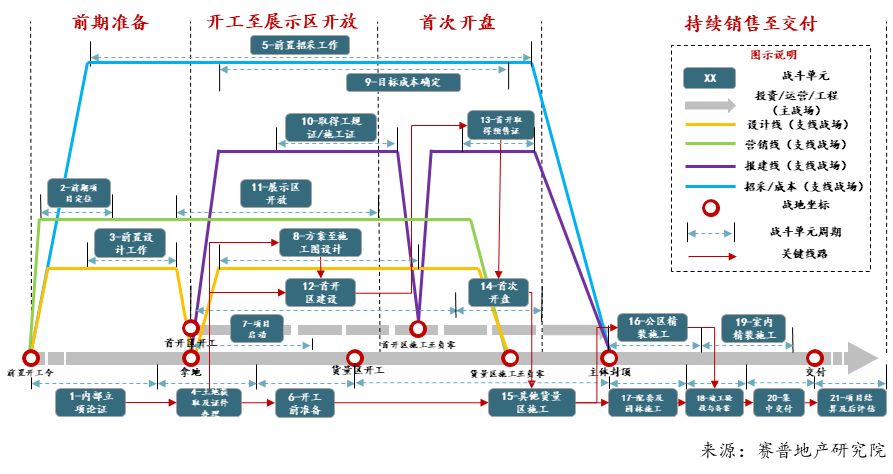 再次,在“一主四支”的基础上形成“战斗单元”,战斗单元是项目总操盘的核心场景,每一个单元赋予对应的周期。21个核心战斗单元分布于不同的战场(一主四支),部分单元相互连接后形成关键线路,“战地坐标”则代表项目开发的关键节点。