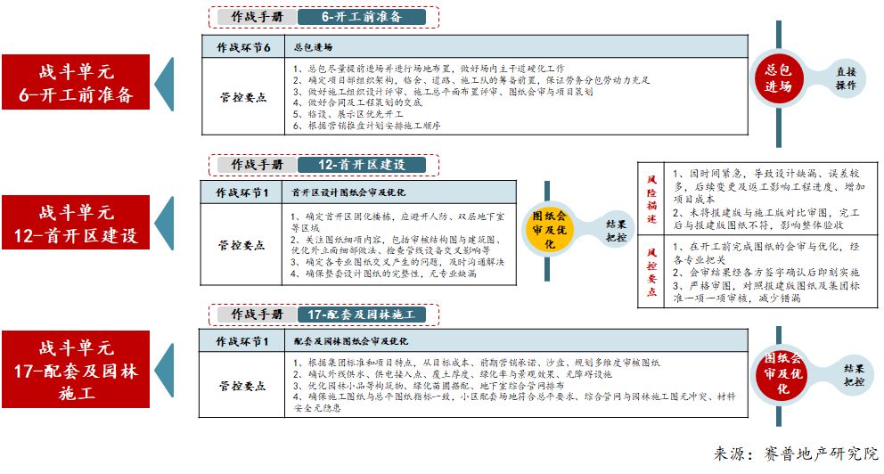每一个作战环节都会匹配经过提炼的管控要点,为突出重点,每个作战环节的管控要点不超过6个。如“17-配套及园林施工”的第1个作战环节是配套及园林图纸会审及优化,有4个管控要点。