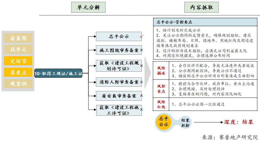 其中的第1个环节就叫“总平公示”,可以看到总平公示要怎样去管控,管控要点有4点,这个环节正好也是一个风险点,下面可以看到风险描述、风险要点和风险红线,了解关于风险有哪些注意事项,这个环节项目总的管控深度是“结果把控”,即不需要直接操作,但要对结果进行把控。如图7。