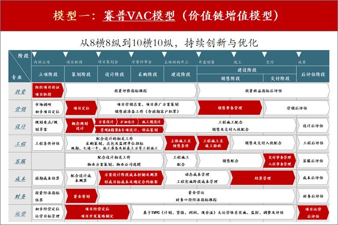 VAC模型通过横向全过程与纵向全专业的梳理,可适配不同业务场景灵活应用(如商业地产开发与营运“10横10纵”),实现价值链分析,为企业管控与流程设计、运营体系设计等提供必要的业务支撑。