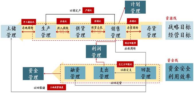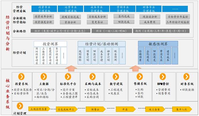 以经营计划与分析2.0平台为核心,卓越通过项目全周期管理系统、投资测算系统、经营计划管理系统、经营分析系统实现了从项目初筛-投资拿地-开发运营-实现交付的全生命周期管理,搭建了“投-产-供-销-存-融-回-支”的全周期价值链条,将各业务工作通过指标关联起来,实现业务联动。如下图所示:
