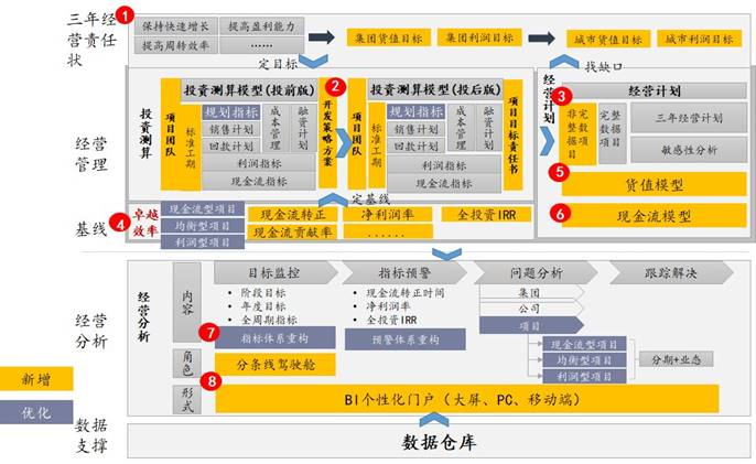 在2.0阶段,卓越集团千亿规模战略下,董事会更加关注围绕经营效率和价值实现构建的指标对标和牵引。一二级分析模块联动新增八大核心内容,即战略测算、投前投后数据打通、非完整数据项目管理、卓越效率应用、货值模型、现金流模型、经营指标重构设计和BI个性化门户。