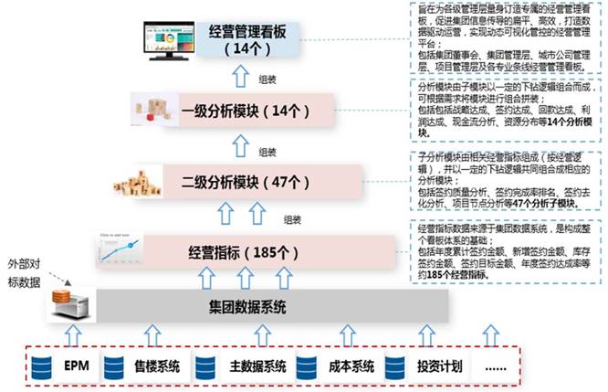 这一经营分析体系涵盖14个管理看板、14个一级分析模块、47个二级分析模块,185个经营分析指标,指标数据来源于集团各业务和管理系统,用于辅助经营监控及经营决策。