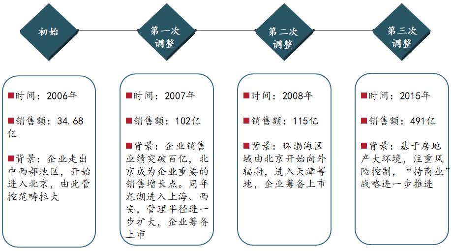 龙湖2011年基于“做长周期赢家,安全穿越现周期”的战略导向,进行了“优土储、强运营、控成本、持商业、精团队”的战略转型,全国化发展迈入新阶段,并确立了商业战略。