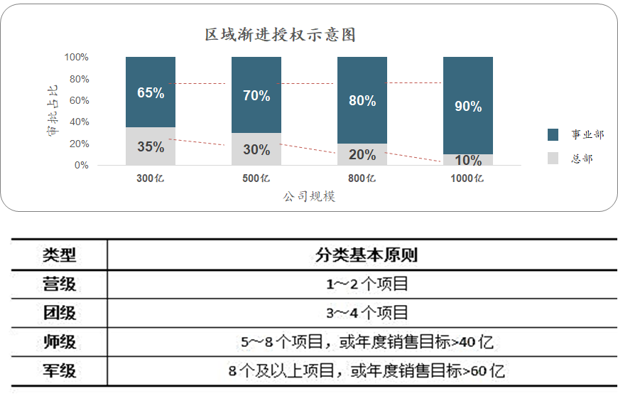 基于战略发展特点,旭辉形成了较成熟的总部-事业部-项目两级半管理架构(200亿-600亿规模期间),且千亿之前变化不大,在此期间根据规模成长通过不断授权调整管控强度,针对“军师团营”等不同级别的事业部制定相应的授权事项。