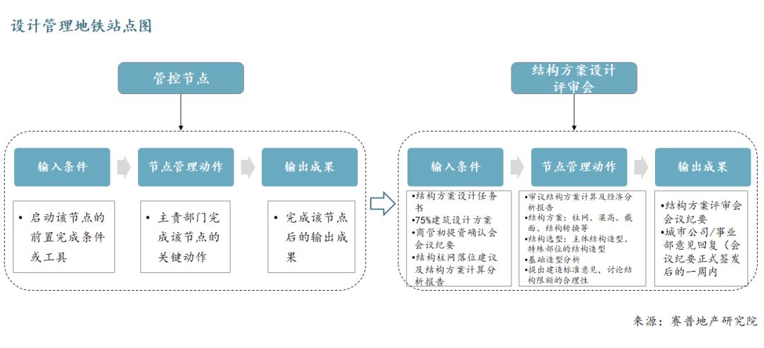 如结构方案设计评审会这一节点,明确其输入条件为结构方案设计任务书、75%建筑设计方案、商管初提资确认会会议纪要、结构柱网落位建议及结构方案计算分子报告;节点管理动作为:审议结构方案计算机经济分析报告、结构方案、结构选择、基础造型分析及建造标准等;输出成果为:结构方案评审会会议纪要。