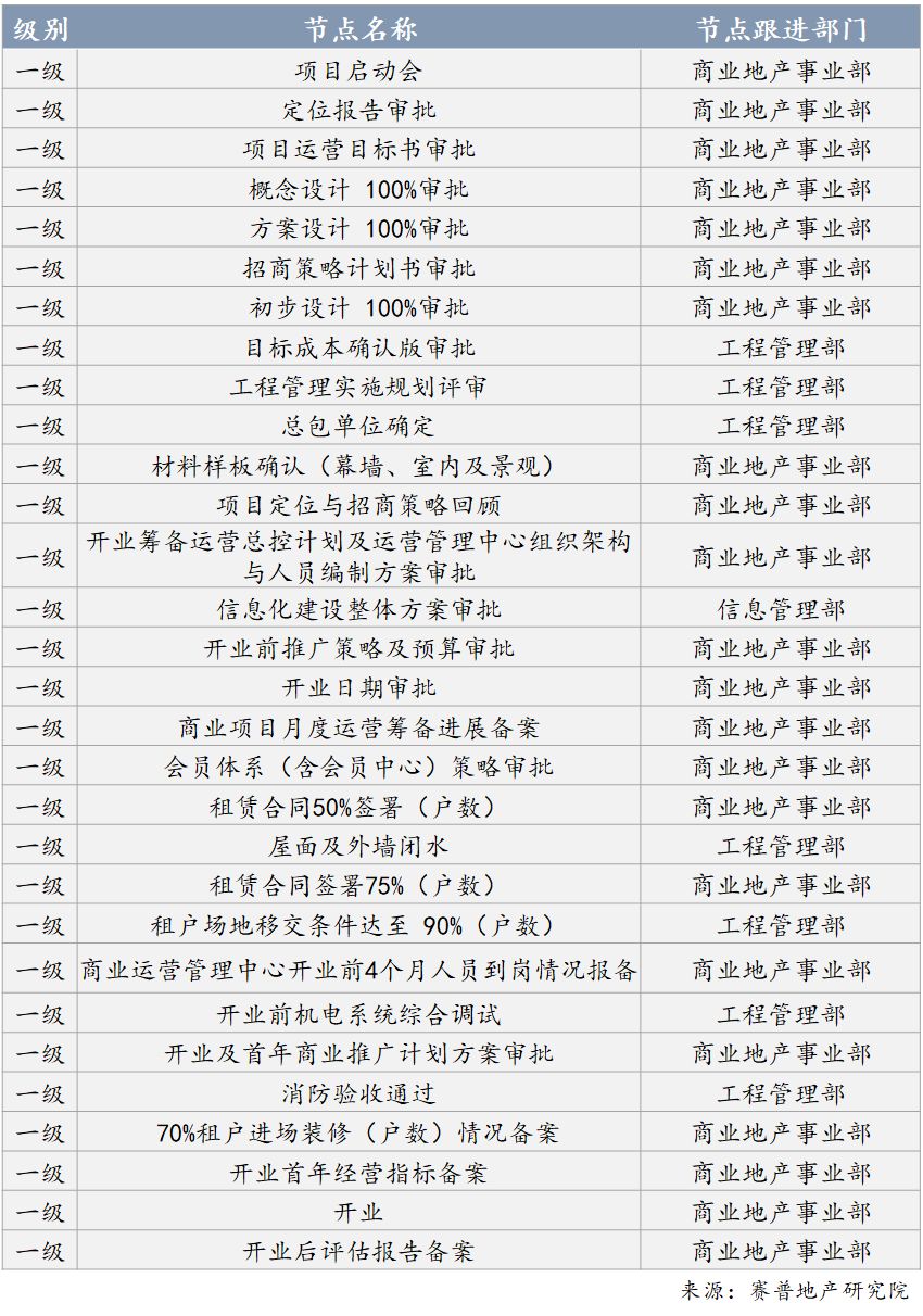 以中国内地第一批进军商业地产的房企Z企为例,其第一个集中商业项目开业于2004年,在十几年的业务积累沉淀,Z企形成了一套通过“管控节点梳理+关键节点管控界面+关键节点会议+关键节点流程”四步法的商业项目建设阶段管控思路,通过规范在建商业项目关键节点管控,保证项目达到整体开发要求及后续运营条件,并有效解决商业开发与后端运营之间的协同问题。