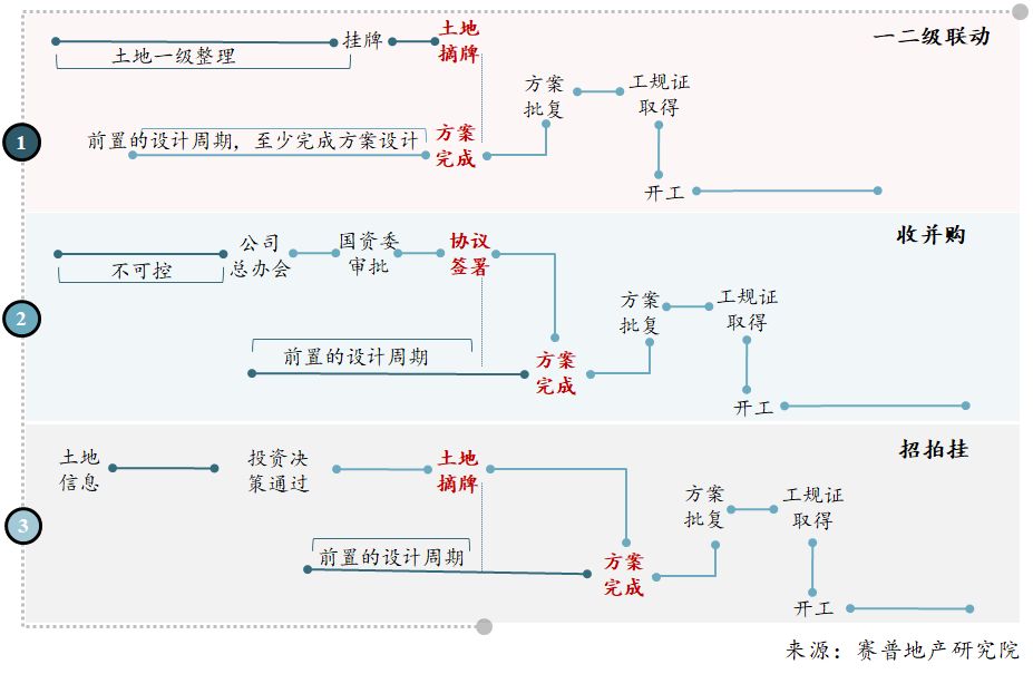 在一二级联动的拿地模式下,方案设计以前的工作都可以在拿地之前完成,即“带着方案拿地”,所以其开发路径上在拿地后直接进入“报建线”,继而进入“工程线”。