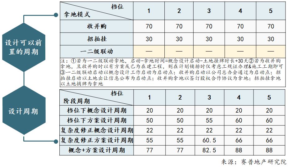 另一方面,差异化的拿地模式决定了设计可以前置的周期的差异化,所以将设计周期与设计可以前置的周期进行结合,可以基本锁定“拿地-方案设计完成”段的合理标准工期。