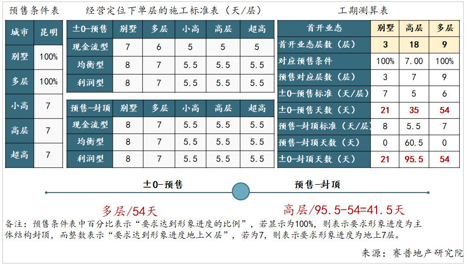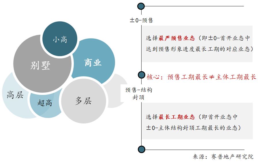 差异化标准工期下,明确合理的工期测算的基本逻辑是,通过录入首开的产品业态及对应业态的层高,基于项目所在城市预售条件、在不同经营定位下的单层的施工天数判断各业态“±0-施工至预售条件”段及“施工至预售条件-主体结构封顶”段所需要的施工周期,两段均选择各分段下最长工期所对应的业态作为度量卡尺。