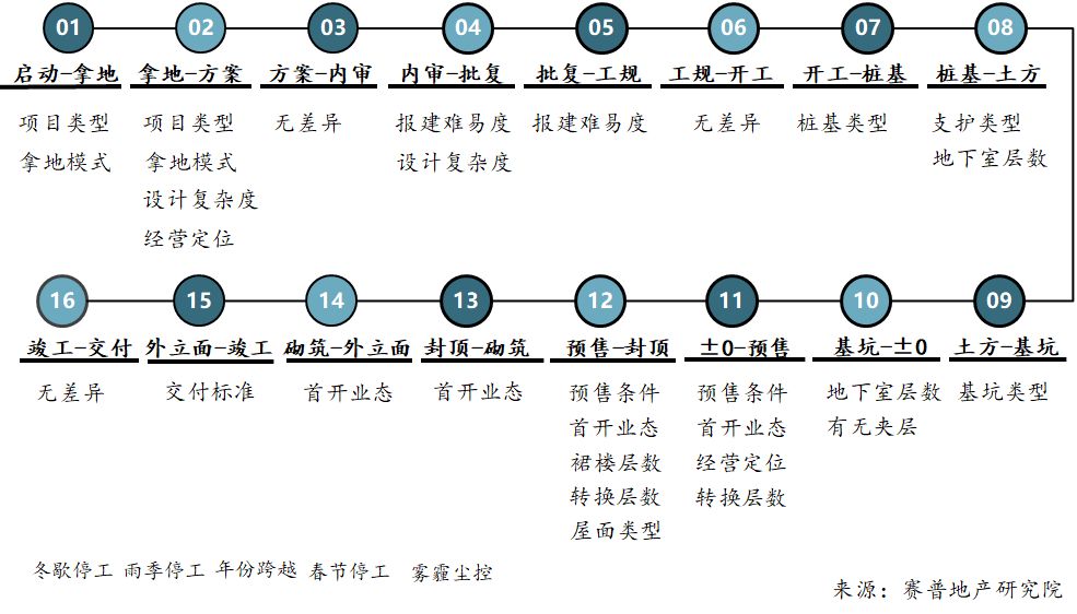 其中,拿地模式差异化决定了工期标准差异化,不同的拿地模式在开发路径上主要影响前置工作的开展,从而影响工期总时长,因此在确定差异化标准工期之前就需要考虑拿地模式的差异化。