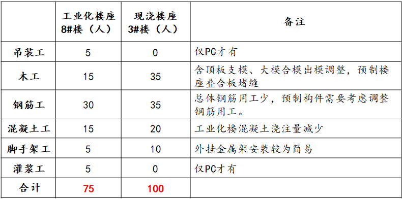 四是减少人工使用。以万科新里程项目的一栋13层住宅建造为例,节省了25%的人工,细目如下: