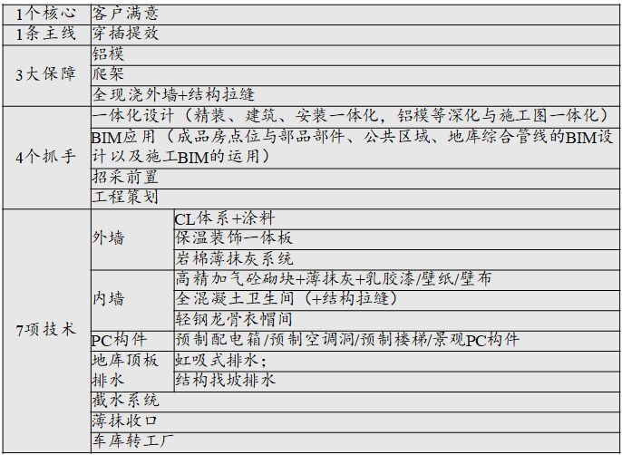 Y企是一家区域级企业,面对行业及自身存在的问题,希望通过建造模式的变革实现“两提三减”——提高综合建造速度、提高产品品质,减少综合建造成本、减少现场人工使用、减少现场湿作业环节。为此其对新建造模式的技术要求进行适用性研究,并建立了与新建造模式相匹配的组织架构、权责体系、开发路径图、项目管理手册、推广应用管理办法等,从而使新建造模式能落地、可复制,其“1-1-3-4-7”新建造体系如下表: