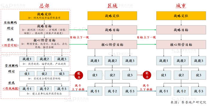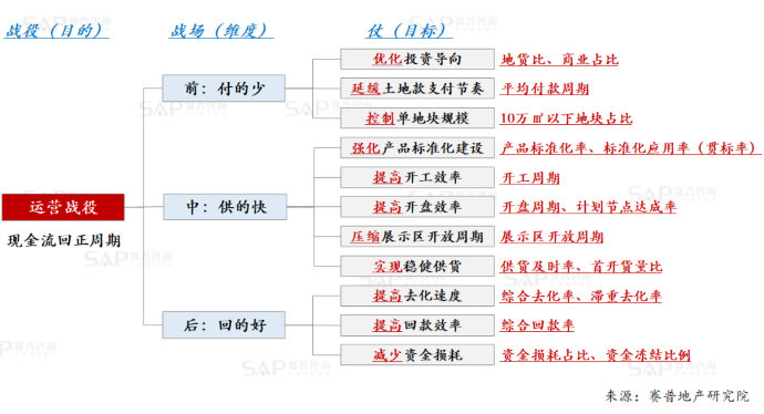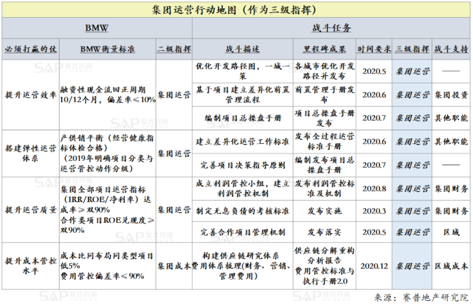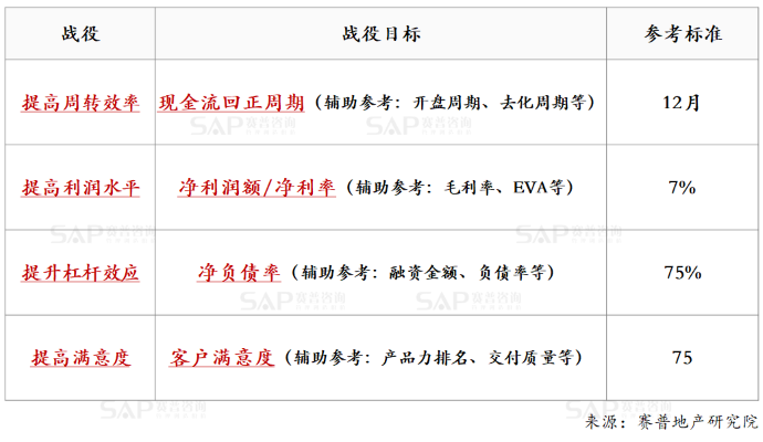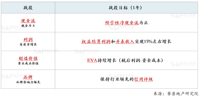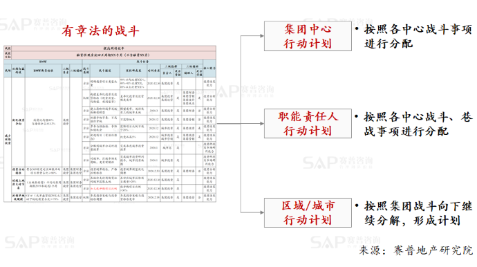 例如A房企在进行战役设定时,重点关注规模、利润、投资与经营4大战役:3年后销售额500亿、净利润50亿(净利润率10%)、实现投资总额640亿、12个月自有资金现金流回正。