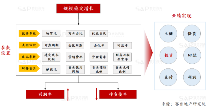如果以规模为最终目标推导经营业绩要求,那么,可基于未来的规模目标来控制输出目标,如利润率和净负债率,设定投资参数、去化回款参数、成本参数和财务资金参数,然后按照业务逻辑推导出业绩实现目标,包括土储、供货、融资和支付等。如图4所示。
