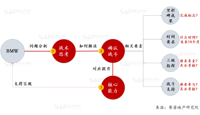 基于BMW目标,同时结合企业当前的问题,可以制定实现目标的战斗,即行动举措,从组织、方法、机制维度分解针对性的行动计划。