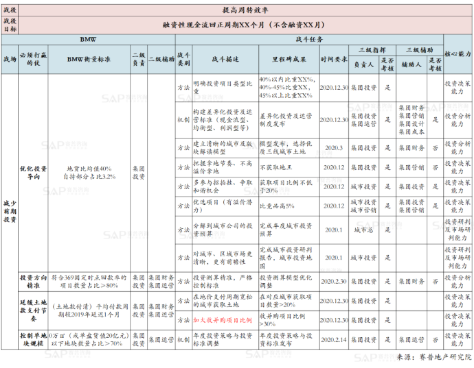 又如B房企重点关注提高周转效率、提高利润水平、提高杠杆效应和客户满意度4大战役。通过测算,当前土地储备已经满足20202021年的发展需要,核心目标是要实现项目转化,因而可不将投资作为重点战役方向分解。