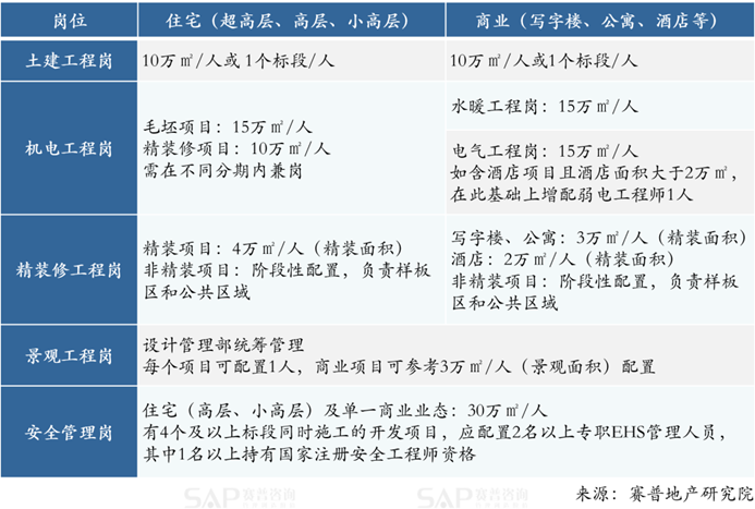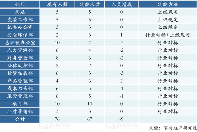 国企业务部门与职能部门定编可对标行业各梯队人均效能(人均销售面积、人均销售额、人均开发面积等),结合企业发展阶段和人员能力进行测算设定。例如中海坚持总部大部制模式,严格控制两级总部岗位和人员编制,要求一人多岗、一人多能。