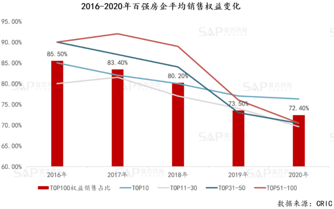 房企之间的合作开发已成为常态,权益销售额占比(权益销售额/全口径销售额)近年来一直处于下降趋势,客观上反映了房地产市场环境的变化倒逼房企加强合作,以撬动更多优质资源和分担风险。如图1。