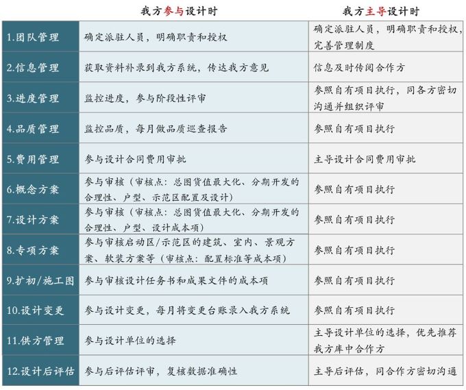 这一风险主要表现在联合操盘项目。例如出图延误直接导致工程进度延误,且难以及时发现图纸存在的问题。在联合操盘的合作项目中,设计可关注如图4所示的12项内容。