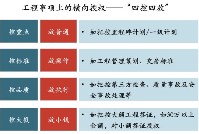又如报批报建滞后,延误工程进度,引发供方索赔,造成开盘、交付滞后。从工程事项上来考虑,可以向合作方或主操盘方来授权,分为横向授权与纵向授权。横向授权建议重点考虑“四控四放”,如图5。