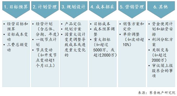 例如,董事会何时开?从房地产业务的特点来看,应“抓头、控尾、放中间”,前期在现金流回正之前,加大董事会召开的密度,通常每季度召开一次;在现金流会回正后,则可降低频率至每半年开一次。在这其中,要锁定一些关键会议时点,例如前期的产品定位、方案设计、开发策略、开盘前这四个关键时点。后期的关键时点包括开业、交付、清算等。