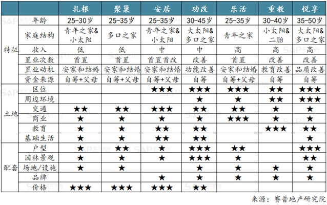 进一步分析每一类客群的特征属性,如年龄/家庭结构、收入水平、置业次数/动机、资金来源等,以及对外在的区位、环境、交通、商业、教育等和内在的户型、景观、设施、价格等的要求,可得出不同客群的特征和置业动机,以此详细描述每一类细分客群的画像,如表1。