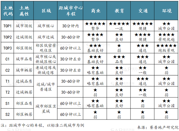 中国金茂则依据区位、距城市中心车程、商业、教育、交通、环境等维度划分土地属性,如表2。