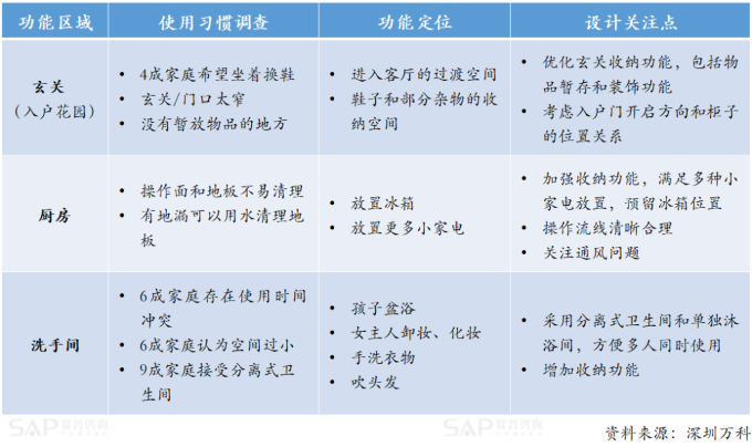 住宅内各功能区域的重要性和表现评价会根据城市、地段、群体等而有差异。其中,一些小功能区间的设计值得重视,这往往是住户评价较低的方面。例如,对于有限的户型空间而言,空间收纳成为提升家居生活品质的重要诉求:一是增加公共收纳空间,考虑大件物品收纳,如玄关鞋柜的容纳空间、生活阳台的储物空间、卧室内的墙面空间等;二是各个功能区域按行为模式设计相应收纳空间。