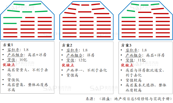 如图7方案对比,货值最大化并非最优选择,要考虑不同产品组合对应的项目总货值、适销性和空间品质,从而避免为了“量”而牺牲“质”。