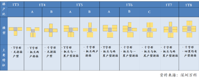 如表3所示,在罗列出十字平台上不同梯户比与不同楼型组合的所有可能性之后,结合购房群体的购置需求,筛选出适合的最佳楼型,确定1T5A户型作为深圳首置(多集中在69-90平米)定型产品楼型、1T4A户型作为首改(100-120平米)定型产品楼型。